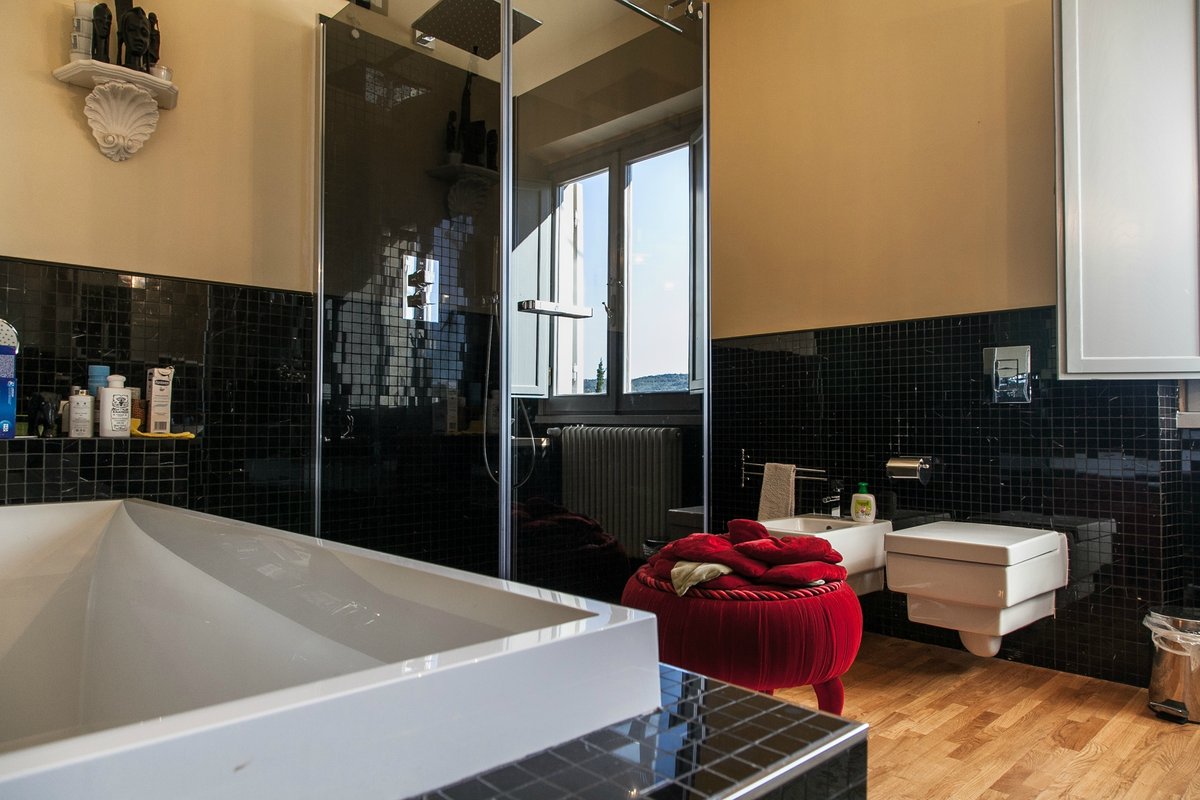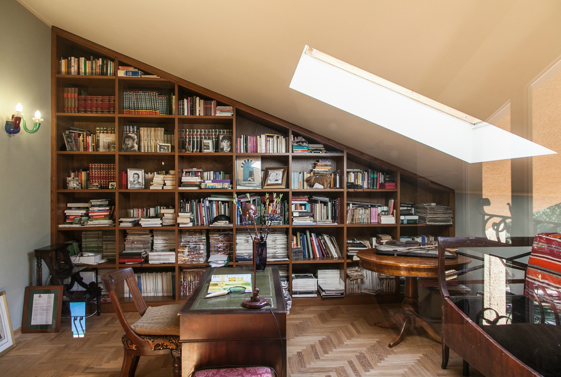 Eine Treppe in der Eingangshalle führt in den ersten Stock, wo sich der Schlafbereich befindet: hier gibt es ein privates Arbeitszimmer/Bibliothek, das Hauptschlafzimmer mit eigenem Bad und exklusiver Panoramaterrasse und zwei Schlafzimmer mit gemeinsamem Bad dazwischen. Die zweite Etage führt zum teilweise ausbaufähigen Dachgeschoss mit einem kleinen Gästebad.