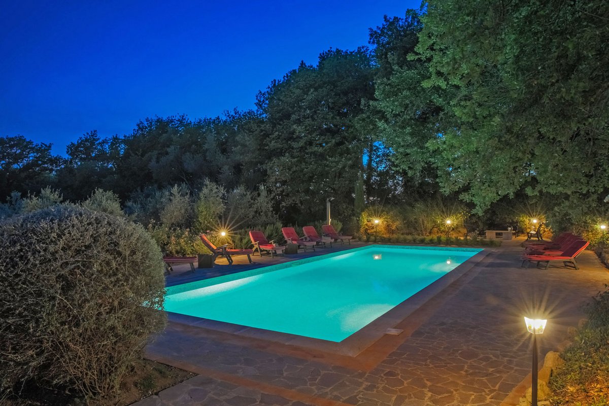 Der 14x5 Meter große Swimmingpool mit Travertineinfassung ist von Olivenbäumen umgeben und bietet einen herrlichen Blick auf das Val d'Orcia.